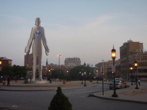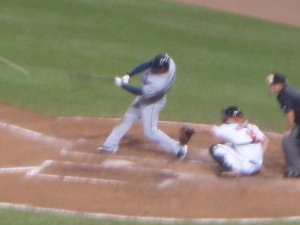 On the way down, we stopped at Camden Yards, where the Orioles went down to the Rays 8-6 and I continued my futile struggle to create good sports photography with a digital camera at a distance of 100 yards. Here’s one shot of Carlos Pena doubling to right. Yes, that is the ball streaking out of the frame.